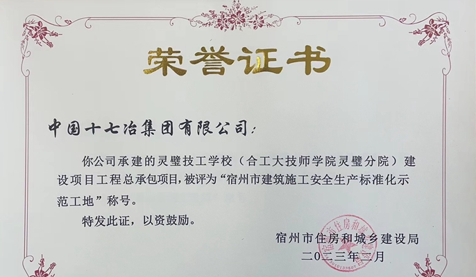 近日,中国十七冶城建分公司承建的灵璧县技工学校项目荣获“宿州市建筑施工安全生产标准化示范工地”称号。
