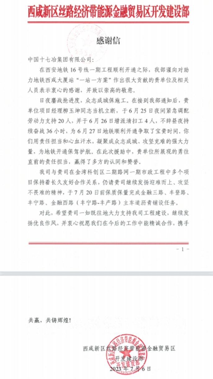 7月6日,西咸新区丝路经济带能源金融贸易区开发建设部向中国十七冶集团致感谢信,对路桥分公司西咸新区项目团队助力西安地铁西咸大厦站“一站一方案”,确保地铁顺利通车表示衷心感谢。