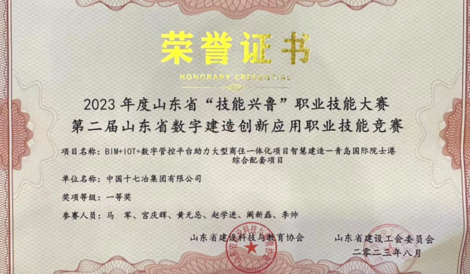 近日,从山东省建设科技与教育协会、山东省建设工会委员会获悉,中国十七冶青岛国际院士港项目申报的《BIM+I0T+数字管控平台助力大型商住一体化项目智慧建造》成果,荣获山东省“技能兴鲁”职业技能大赛暨第二届山东省数字建造创新应用职业技能竞赛一等奖。