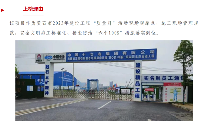9月25日,中国十七冶建安分公司承建的磁湖绿色廊道工程入选黄石市住建局发布的2023年建筑工地“首期争优”红榜。