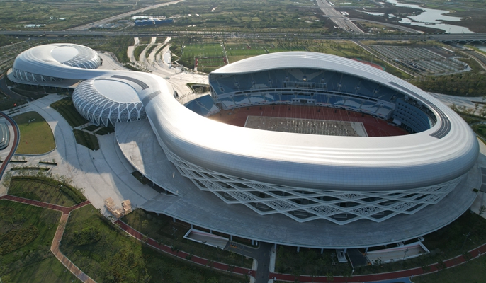 作为滁州递向世界的一张城市新名片,奥体中心是一座在设计上既彰显滁州地方特色,又具有国内首创工艺的国际标准体育中心。其以“如意青花锦绣”为设计立意的“一场两馆”,外形如同古代玉器“玉如意”,屋盖相连的场馆如锦绣绸缎般灵动飘逸。体育场外立面为国内首创的“镂空式双层双曲面钢管雕花组合幕墙”,两馆外幕墙设计也是国内首创的“双层双曲面实心铝板雕花组合幕墙”,内设双层夹胶中空钢化超白玻璃幕墙系统,大面积采用自然光线,场馆内公共区域大空间明亮通透,处处体现了建筑节能和绿色建造理念。