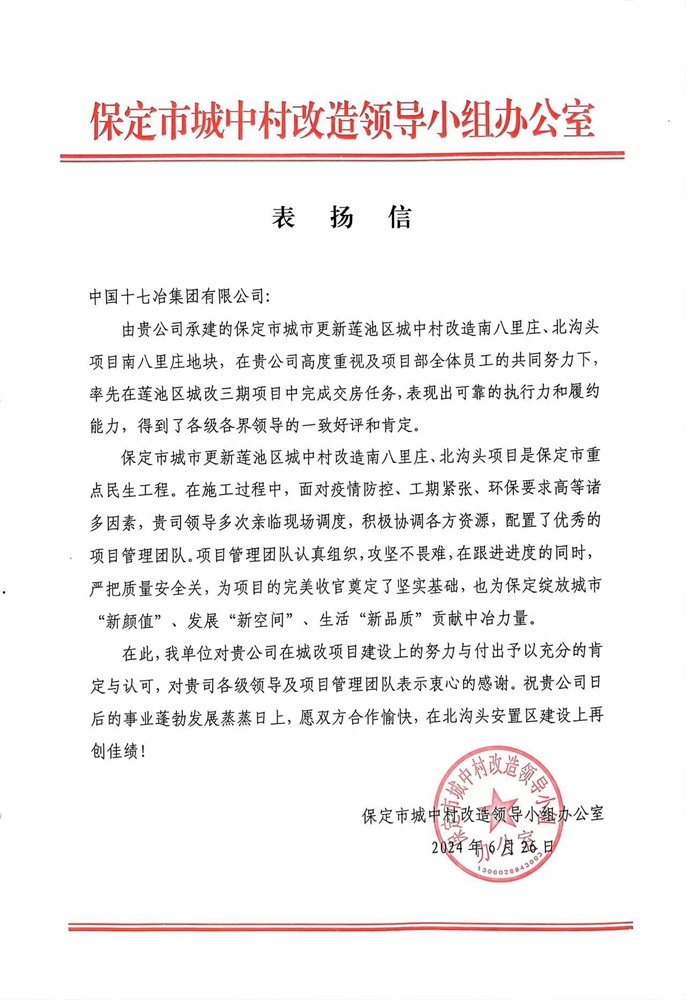 6月26日,保定市城中村改造领导小组办公室向中国十七冶集团致表扬信,对房屋分公司保定市城改七标段团队在莲池区三期项目中率先完成交房任务,表现出的可靠执行力和履约能力给予好评和肯定。