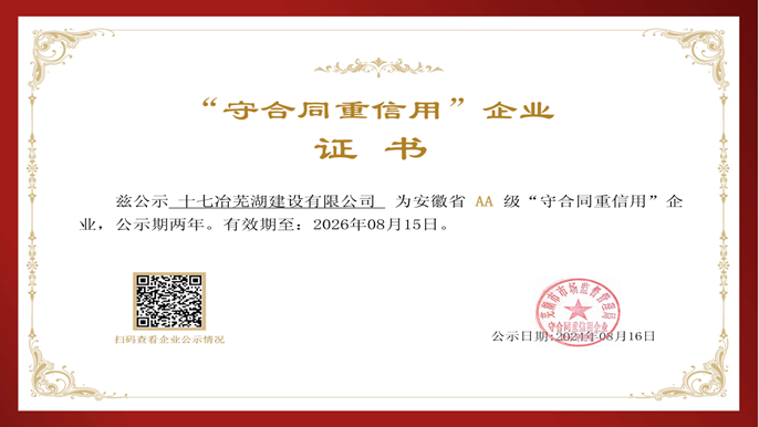 安徽省“守合同重信用”企业评价从依法纳税、信贷管理、合同履约、产品质量等方面信用记录进行综合考核,结果将作为企业经营日常监管的重要依据,在政策扶持、招标投标、评优表彰等工作中进行有效运用。获评安徽省AA级“守合同重信用”企业也是对十七冶芜湖建设有限公司在管理能力、经营状况、社会信誉、诚信体系建设等方面工作的充分肯定。