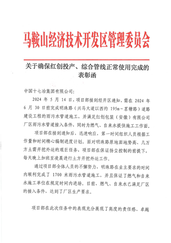 10月28日,马鞍山经开区管委会向中国十七冶致表彰函,对经开区银塘单元路网项目真抓实干,积极对接经开区入驻企业需求,按期保质完成明珠路雨污水管道施工任务,确保企业投产、管线投用致以感谢。
