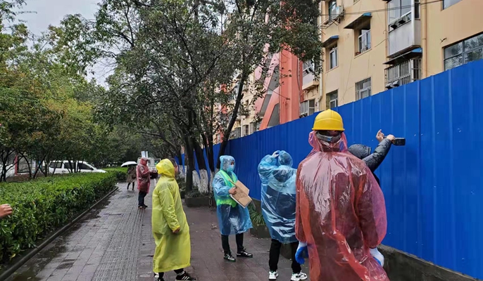项目党支部书记的老江负责指挥施工材料用车的调度,由于点多面广,部分小区道路窄,各区域同步开展围挡施工,致使协调工作难度增大,过程中出现了材料断档、人员紧缺现象,这让老江如坐针毡。老江的心中着急,挨个给十七冶周边在建的项目部打电话:“我们正在封闭作业,涉及区域太广,材料紧缺,能否协助我们完成小区封闭工作?”各项目紧急协调配合,车辆、器械、彩钢板和人员等迅速到位。