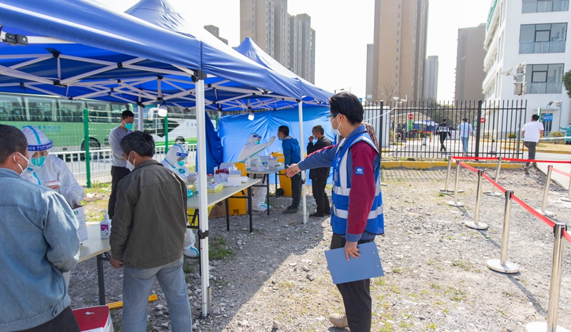 自3月21日起,云翔项目部主动纳入属地疫情防控体系,配合嘉定区海蓝路核酸检测点,为周边社区开展核酸检测。十七冶志愿者们全副武装,掰棉签、发号码、填表格,从早上七点到下午三点,完成核酸检测3000人次,得到了相关部门的一致好评。