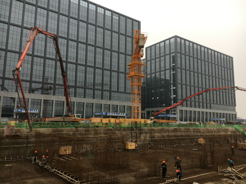 安徽省新型城镇化建设项目位于蚌埠市高新区姜桥路南侧,山香路东侧,中环线北侧。项目总建筑面积为18.2479万平方米,其中地下室建筑面积为1.9475万平方米,地上建筑面积为16.3003万平方米,由4栋办公楼,2栋公寓楼,2栋食堂组成。此次完成浇筑的倒班宿舍A工程地下室底板所需混凝土大约1350m³,强度为C35,防水等级为P6,添加6%SJ-K膨胀抗裂防水剂。