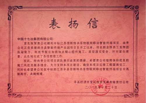 10月22日,丰县经济开发区发来表扬信,对中国十七冶集团房屋工程技术分公司承建的丰县智能终端产业园项目部给予了高度赞扬。