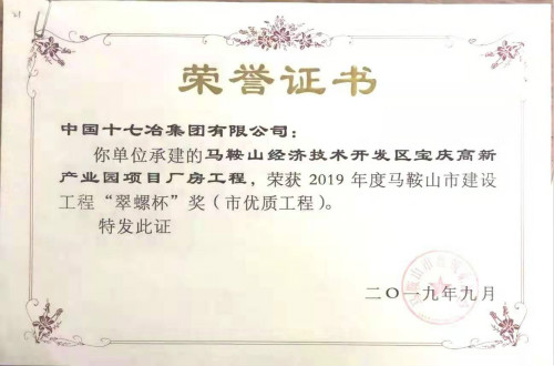 1月9日,从马鞍山市建筑业协会获悉,中国十七冶集团房屋工程技术分公司承建的马鞍山经开区宝庆高新产业园厂房工程喜获马鞍山市优质工程“翠螺杯”奖。