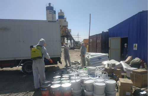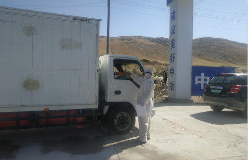 根据乌国疫情发布信息,由哈萨克斯坦进入乌兹别克斯坦的大货车司机出现多例确诊,而大货车是必须进入施工现场的,如何把大货车司机可能带入疫情进现场的风险降到最低是一个防控关键点。为此,项目部重新作出部署,在进入现场的主大门入口,原来作为施工人员进入现场的实名制通道,也是入场车辆的唯一入口。为了阻断外来大货车司机与施工人员接触的可能性,项目部封锁了大门处的实名制通道,从生活区后方重新设置一处人员通道,现场大门处仅供车辆通行使用,实现人车分流。入场的大货车需经过两道关,第一道是在厂区外接受初步的消毒和测温检查,第二道即是在项目部入场大门前接受全面的消杀处理和测温复查,并对大货车贴条封闭,严禁司机在场区内下车走动与场内员工接触。期间对大货车进行消杀和检查的人员必须提前穿戴好防护服、护目镜、口罩等防护用品,并于事后进行彻底的消毒处理。