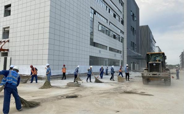 随着智能终端产业园施工接近尾声,项目建设进入了最后的冲刺阶段。自13日以来,项目部全体成员放弃休息时间,推迟用餐时间,利用每天六点半下班后、晚餐前一小时间隙,到项目施工现场义务打扫卫生、清运垃圾,开展“收尾保工期”义务劳动。项目全员分工明确,用铁锹和笤帚铲除淤泥杂物,清理浮土垃圾。八月的酷热天气点燃了项目全员的劳动热情,现场人员挥汗如雨、干劲十足,为美化项目现场环境、实现降本增效,做好项目收尾工作,早日实现项目竣工交付积极贡献力量。