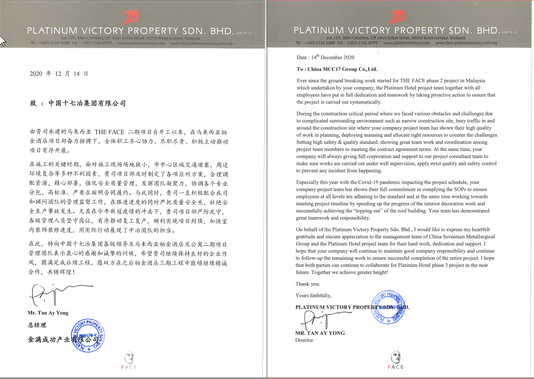 近日,马来西亚金满成功产业有限公司向中国十七冶集团致表扬信,对房屋工程技术分公司马来西亚吉隆坡铂金酒店及公寓二期工程项目部取得的突出业绩给予充分肯定,并提出表扬。