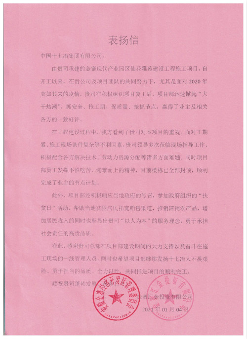 表扬信称,金寨现代产业园区仙花雅苑项目自开工以来,面对突如其来的疫情,积极组织项目复工复产,迅速掀起“大干热潮”,项目部抓安全、抢工期、保质量、抢抓节点,赢得了业主及相关各方的一致好评。面对工期紧、施工现场条件复杂等不利因素,十七冶领导多次亲临现场指导工作,积极配合各方解决技术、劳动力资源分配等诸多难题,顺利完成全部楼栋封顶任务目标。项目部还响应当地政府号召,参加政府组织的“扶贫日”活动,帮助当地贫困居民拓宽销售渠道,推销滞销农产品,在增加居民收入的同时,彰显了十七冶“以人为本”的服务理念,体现了勇于承担社会责任的高贵品质。