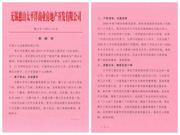 表扬信中指出,无锡太平洋三期工程自开工以来,项目团队发扬十七冶“高效严谨、精细务实”的企业精神,凭借过硬的技术水平和精细化的管理,分别于2020年9月、11月顺利完成了住宅、公寓两批次交付工作。施工期间,项目部管理团队敢于担当、敢于奉献、不畏艰难、勇于挑战,克服了施工过程中的种种不利因素,坚持质量为本,加强项目精细化管理,加强与各职能部门协调沟通,展现了央企的责任与担当,彰显了品牌实力,实现了无锡市惠山区首例一次性竣工交付体量最大、质量最好、上访投诉率几乎为零的目标,为“中国十七冶”乃至整个“中国中冶”铸造了良好的口碑。希望十七冶继续发扬艰苦奋斗,迎难而上的优良作风,加强团结协作,顺利完成项目超高层项目的建设工作,携手共建美丽无锡。