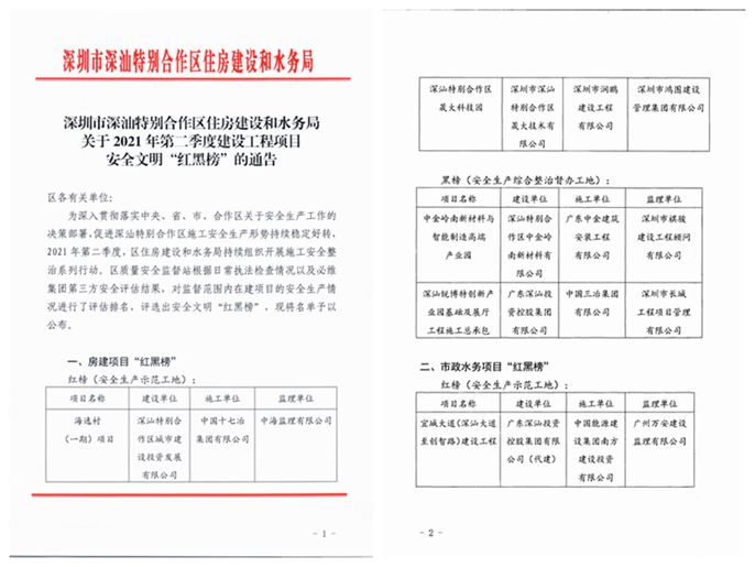 深汕特别合作区质量安全监督站根据日常检查情况以及第三方单位安全评估结果,对其监督范围内在建项目的安全生产情况进行了评估排名,评选出2021年二季度建设工程项目安全文明“红黑榜”,深圳海逸村一期项目荣登红榜。