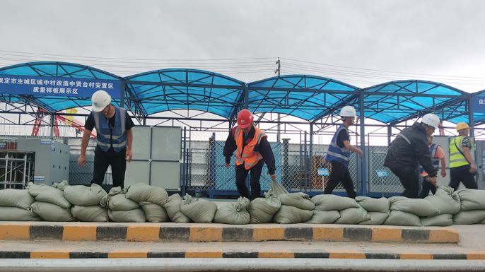 自保定市地方气象部门发布强暴雨信息以来,保定市ABO项目部迅速做出反应,及时启动防汛应急预案,组织项目全体管理人员,成立防汛救援应急小组,提前储备应急物资。项目部防汛救援应急小组装袋运送200余袋防汛沙包,对可能出现险情的部位进行加固;同时组织专人排查施工场地隐患部位,及时标识、整改;提前安放抽水泵,做好排水准备。