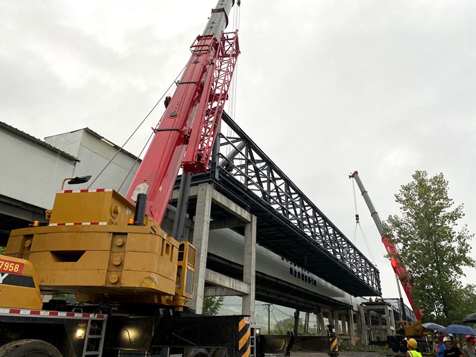 跨353国道50.5米钢桁架的吊装完成,标志着自弋阳海螺矿山脚下至姚畈村后山钢桁架已基本全线贯通,主厂区外全长近15公里廊道部分已完成三分之二,极大鼓舞了在当前紧张工期条件下加班加点的作业人员和管理人员,也为项目实现顺利投产奠定了坚实基础。